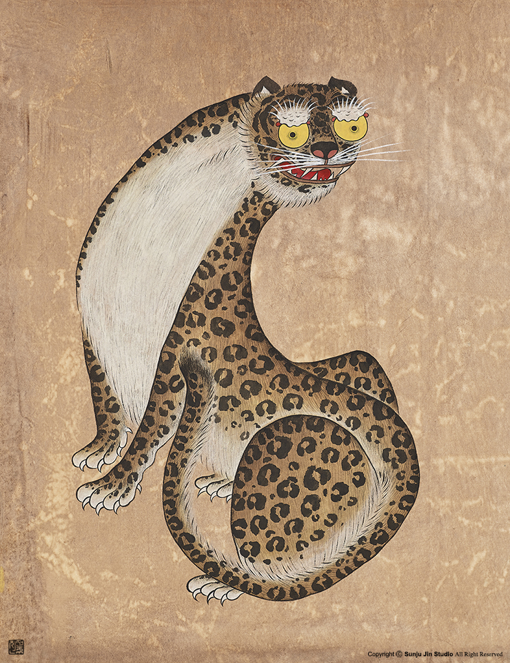 Leopard(or Tiger) is a popular subject in Korean Art. The spiritual animal is often described as a god of the mountain in old Korean stories. Having no such technology as photography most of the artists must have painted the animal only from a glance or inspired by someone else’s painting. That is why the facial expressions in leopard painting are various and often exaggerated I imagine.