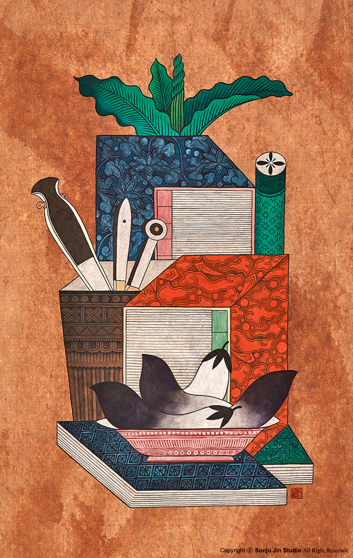 This Chekgado (Korean still life painting mostly with books and valuable objects) is one of the three set. (V1,2,3)