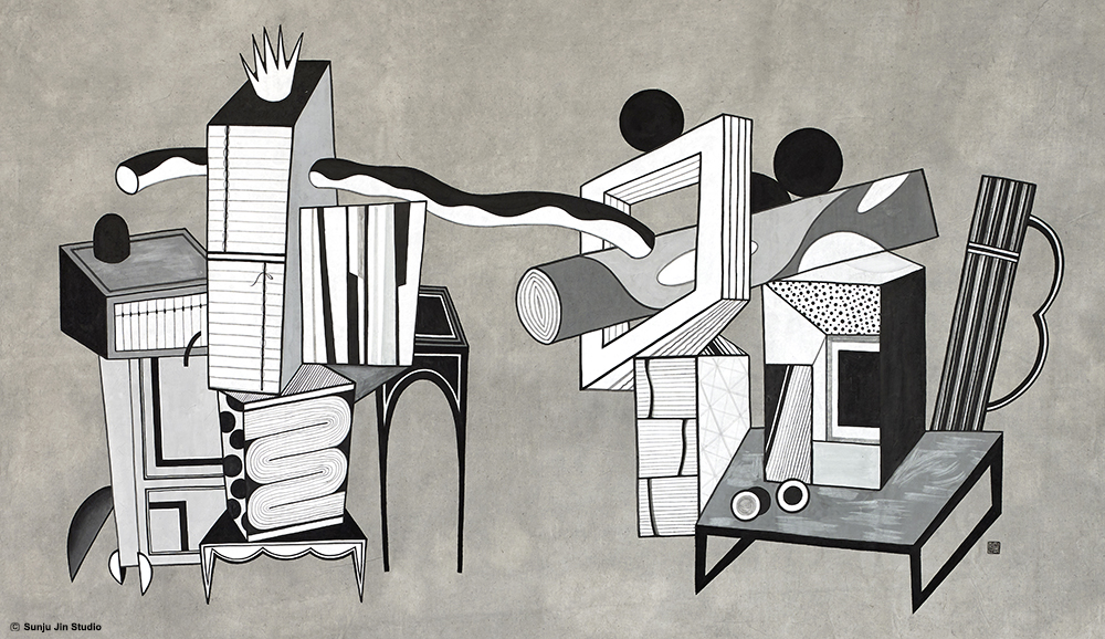 어릴 적 텔레비전에서 미키마우스 캐릭터들이 바쁘게 뛰어다니며 흩뿌리던 픽셀들이 아직도 머릿속 구석구석에 기분좋은 먼지처럼 남아있다. 유쾌하지만 차가운 그 미소는 호분과 먹 이외에는 필요치 않는다.