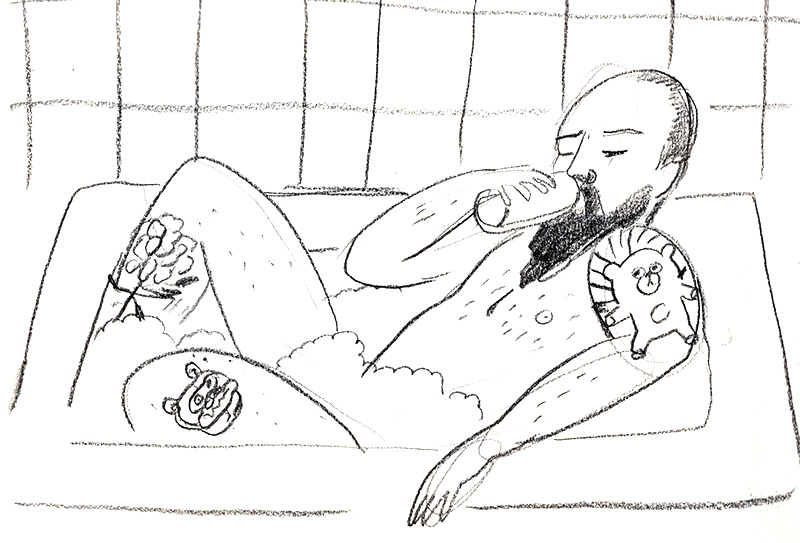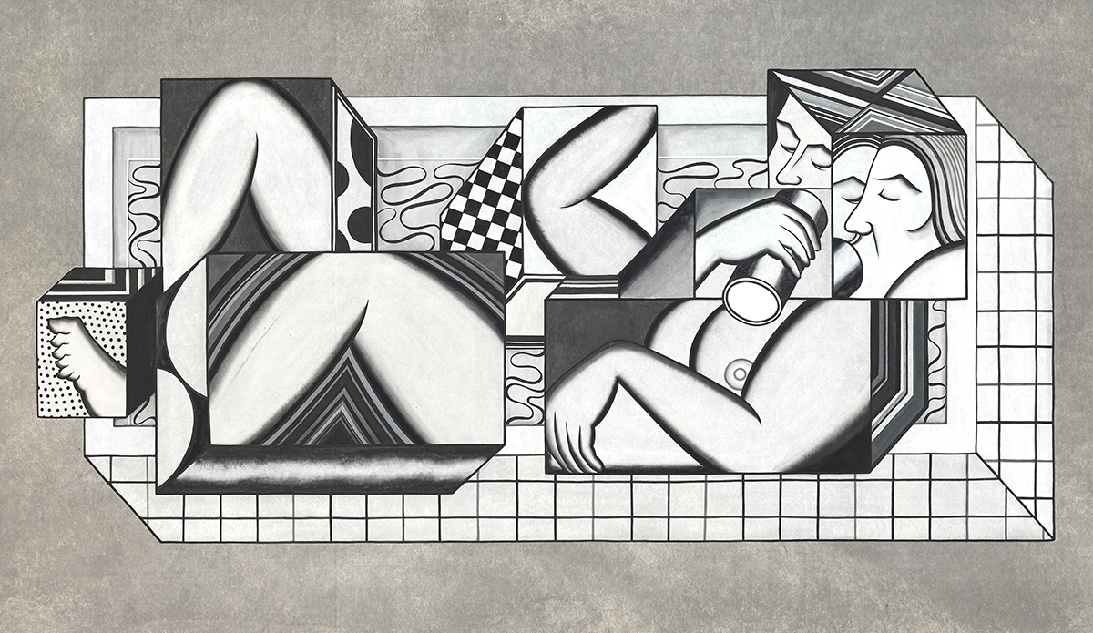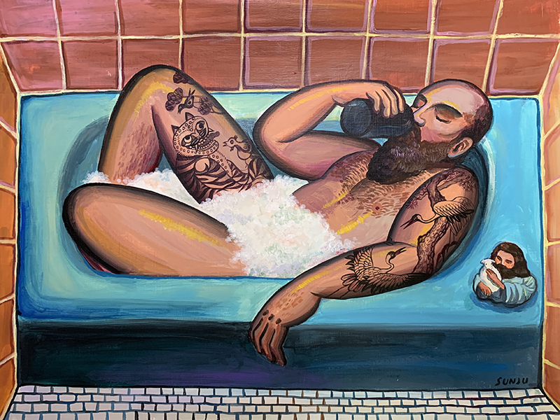 이 작품은 혼자서 맥주를 마시며 목욕을 하는 남자로 시작했는데 커플로 완성 되었다.